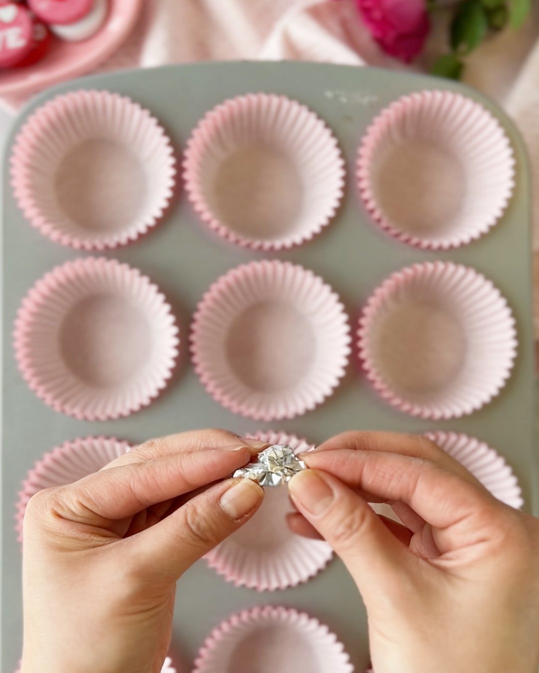 Roll a bit of tinfoil into a ball, and place ball between cupcake pan and cupcake liner (at the top) to create a heart shape.