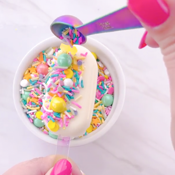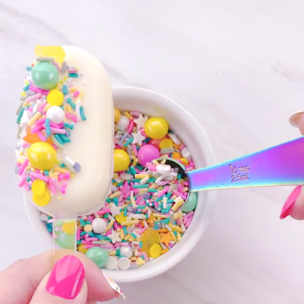 For sprinkles: Use kitchen tweezers to gently place your sprinkles onto the melty cakesicle surface. Start with your biggest sprinkles and work your way down to the smallest. You can also pour them on if they’re all super small. Carefully shake or brush off the excess.