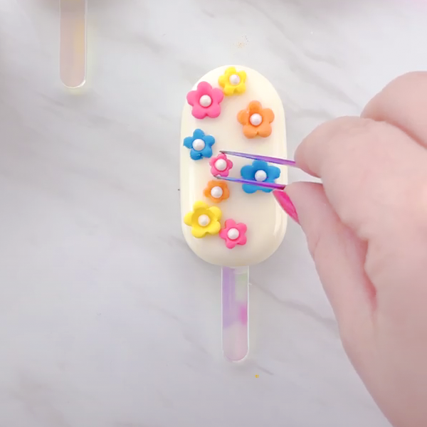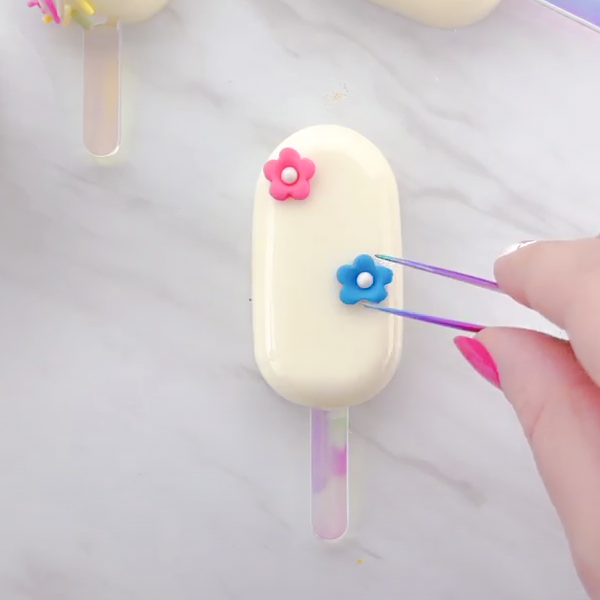 For fondant decorations: Gently place your tiny treasures on the melty cakesicle surface with kitchen tweezers or your fingers.