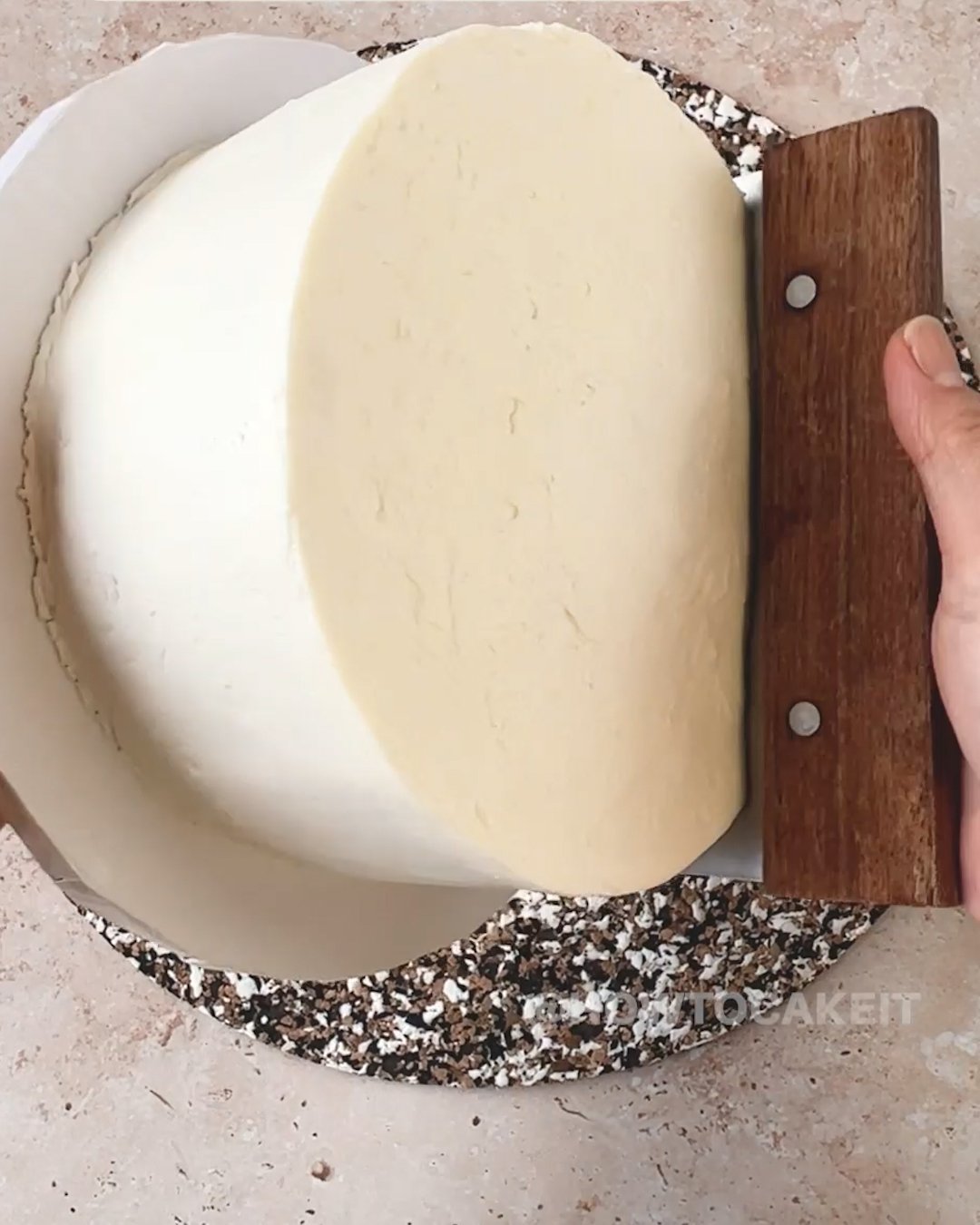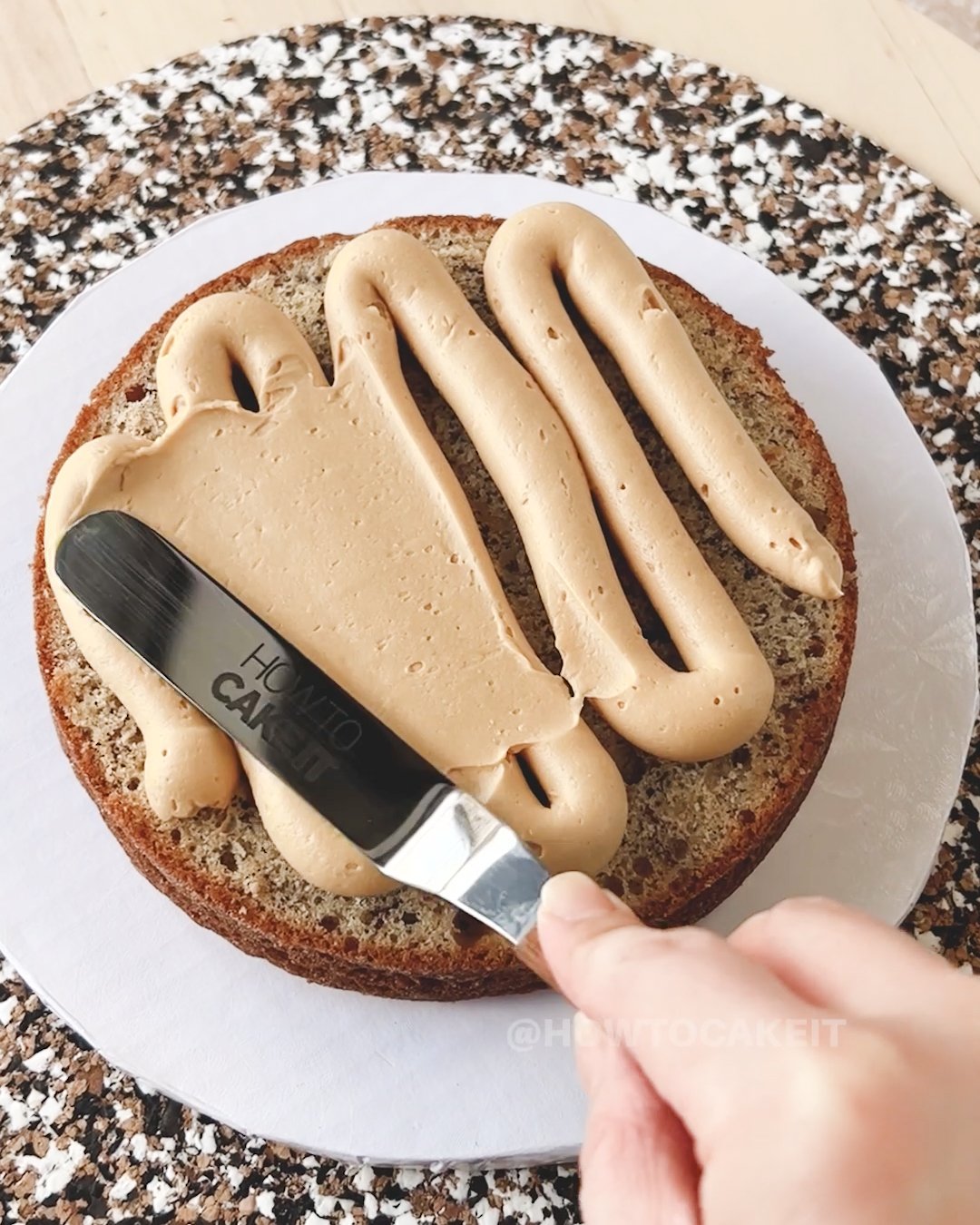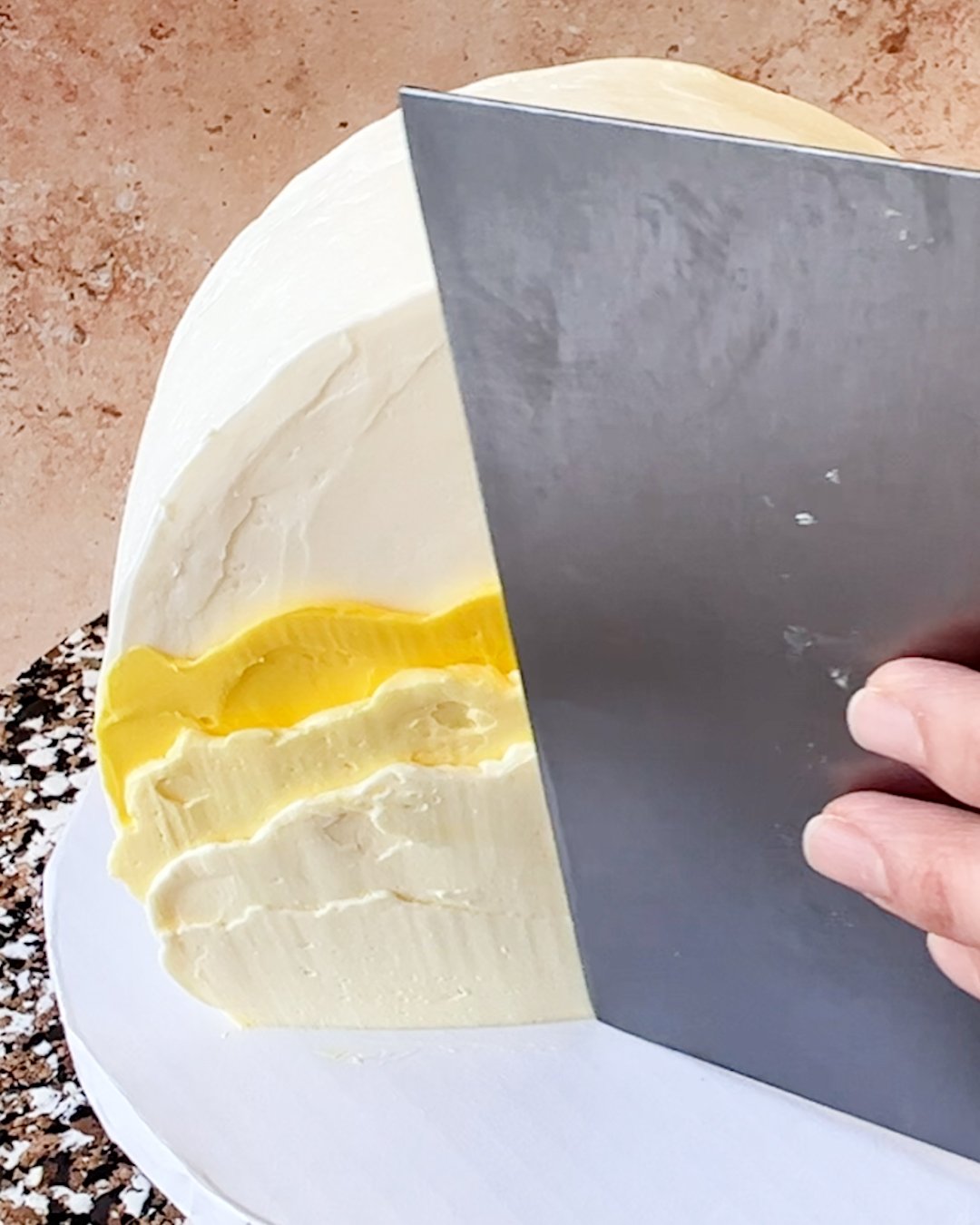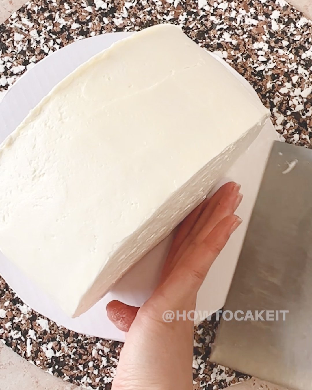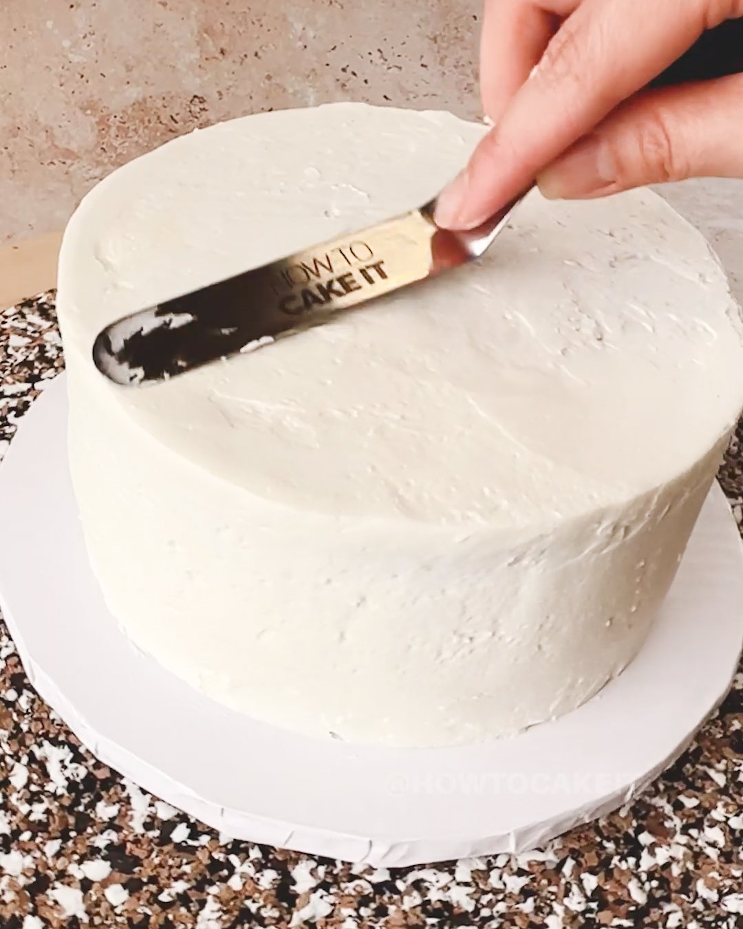 TIP: once you are happy with each layer of buttercream, use a clean metal bench scraper to smooth out the surface.
