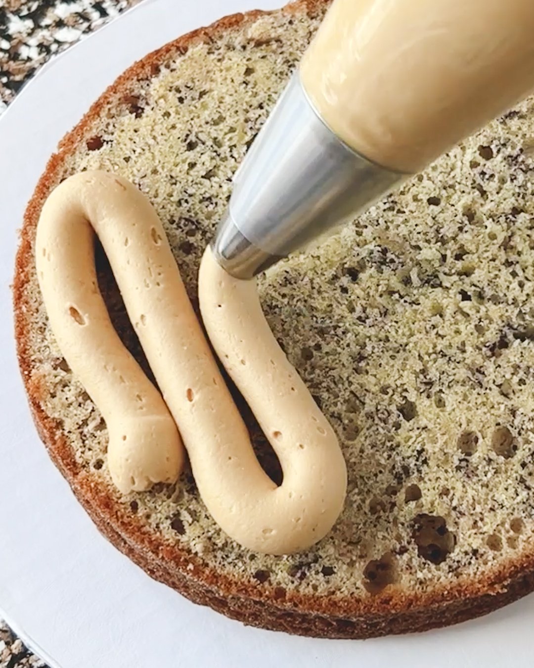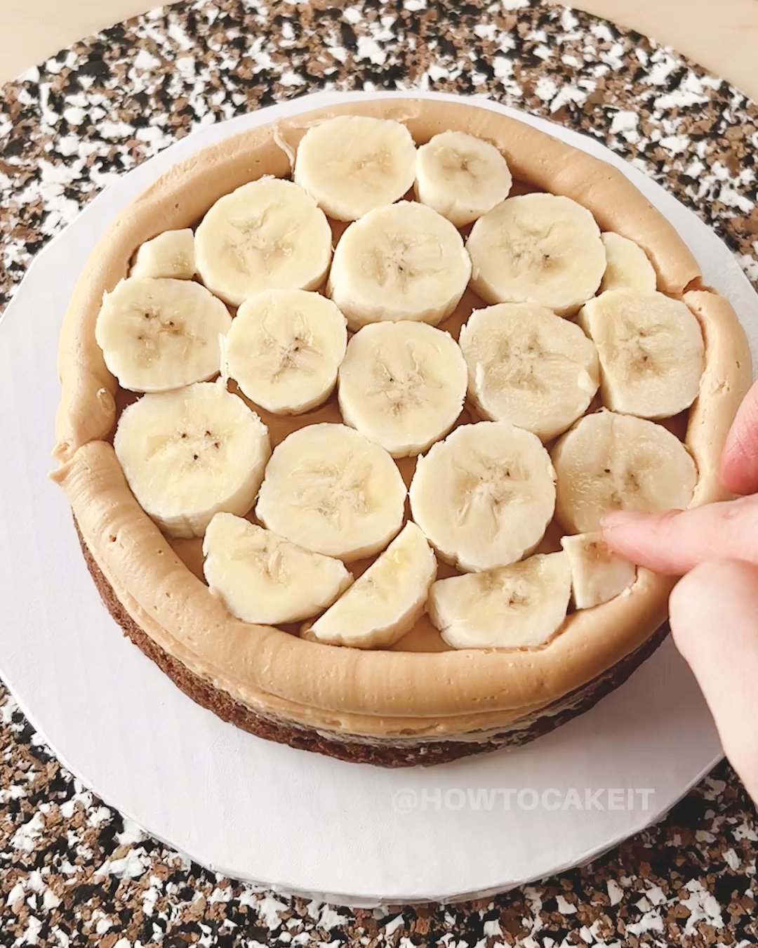 Use an offset spatula to spread a dollop of Italian meringue buttercream (or frosting of your choice) into an even layer. With a piping bag fitted with an #805 tip, pipe a fence of buttercream along the edge of the cake layer. Arrange banana slices along the inside of the fence, and drizzle with caramel.
