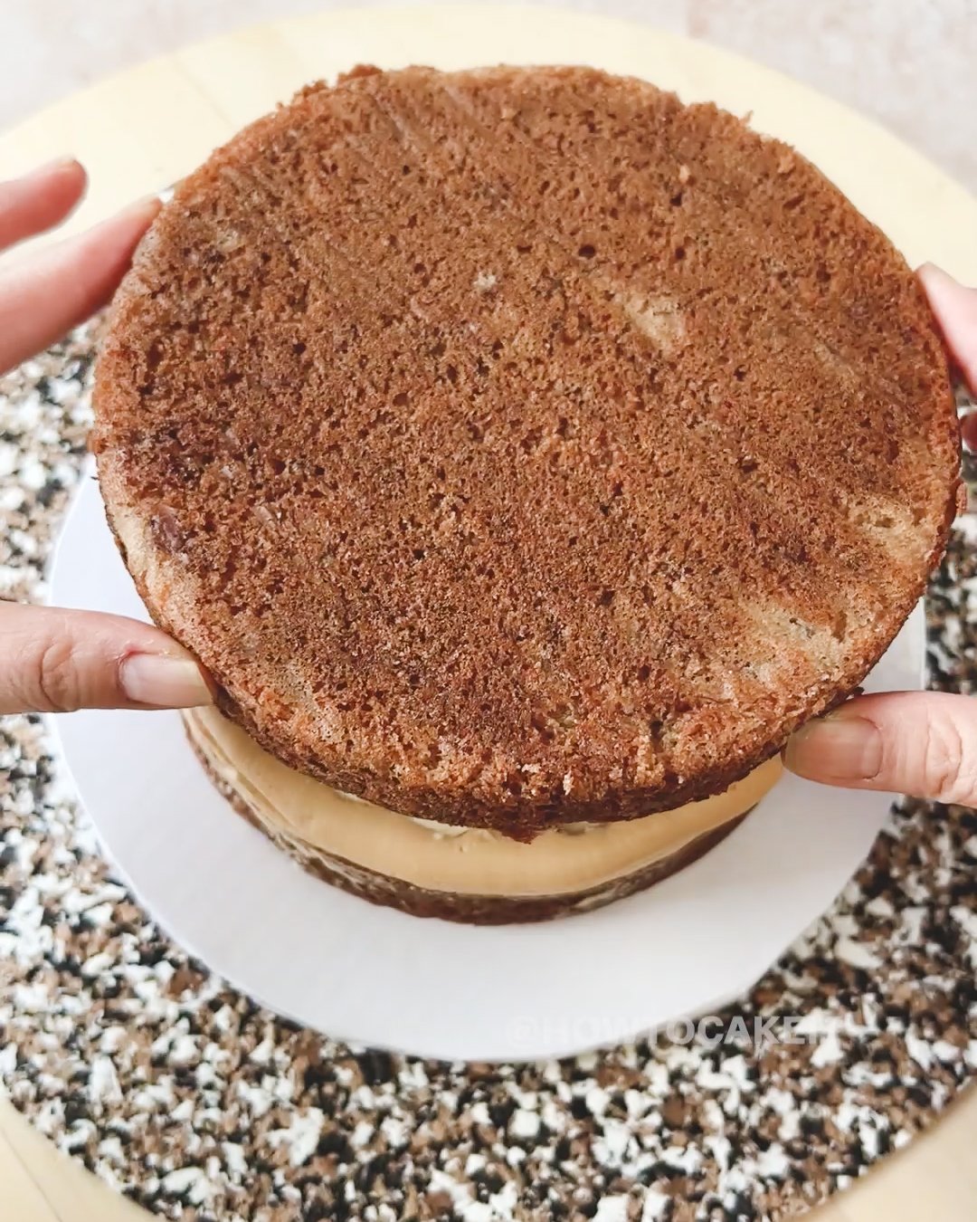 To build the banana caramel cake, remove the cake humps with a ruler and serrated knife.