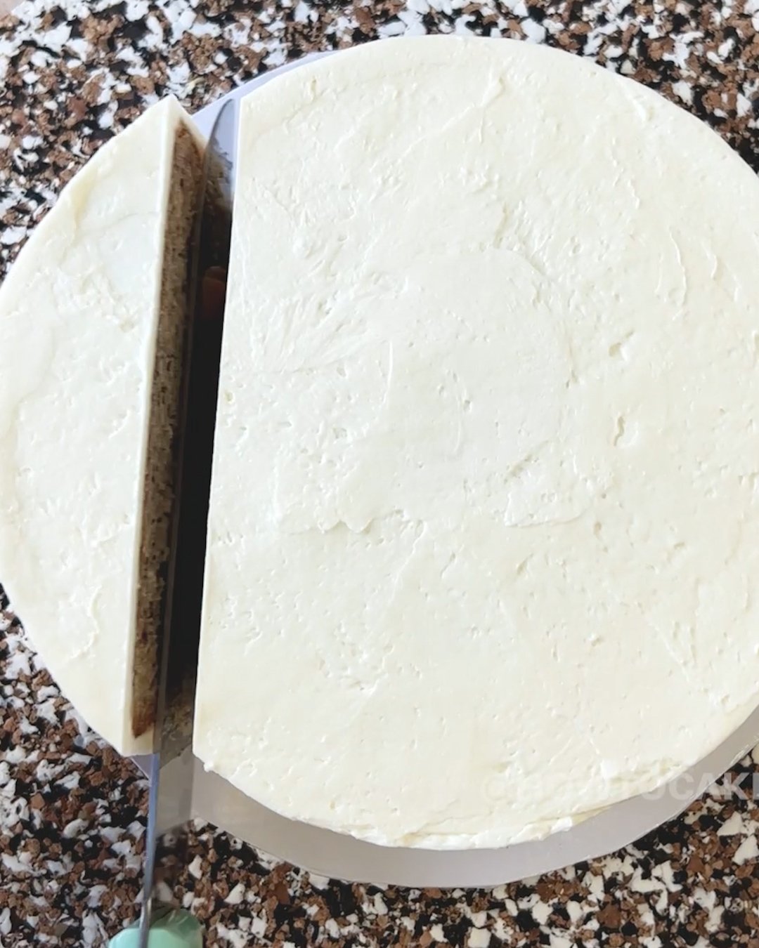 Using a large straight spatula, ice the cake with a final layer of buttercream, and allow to chill in the fridge completely.