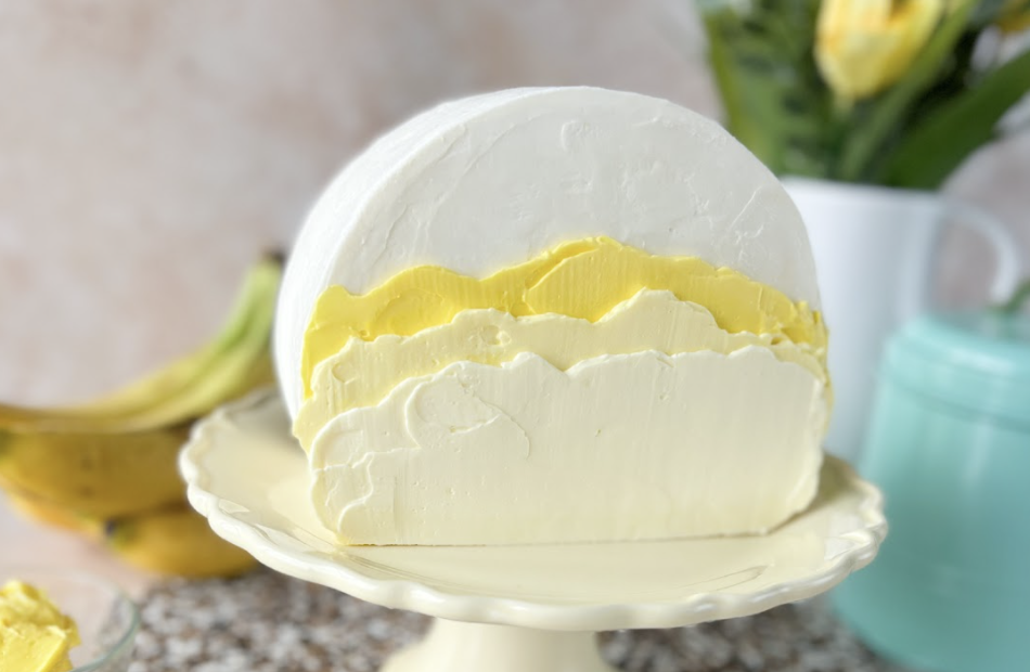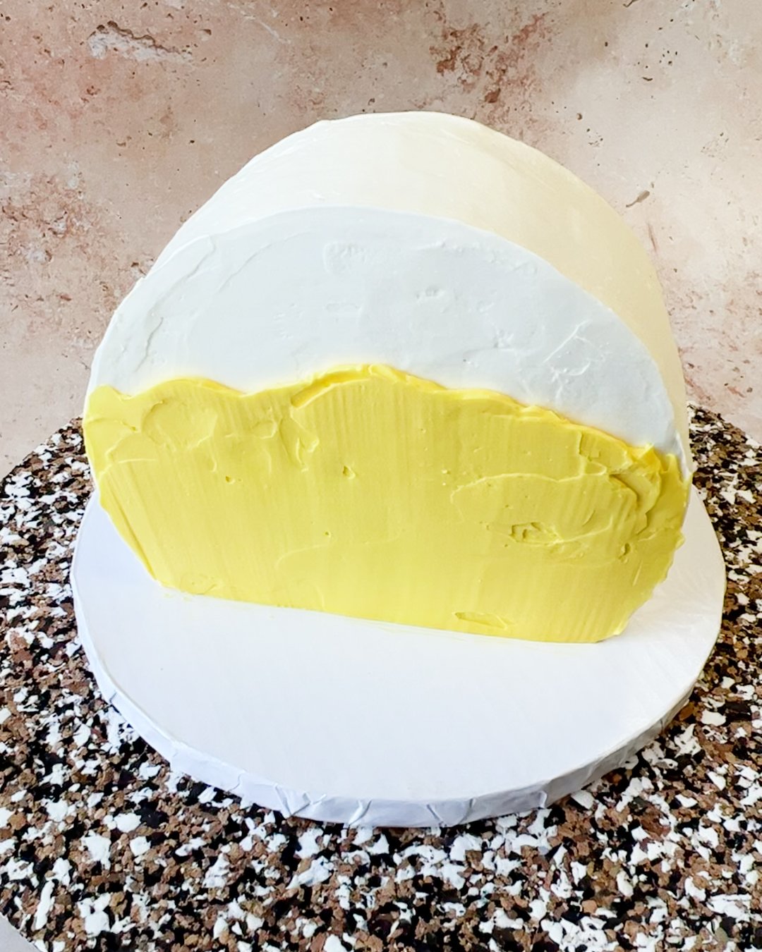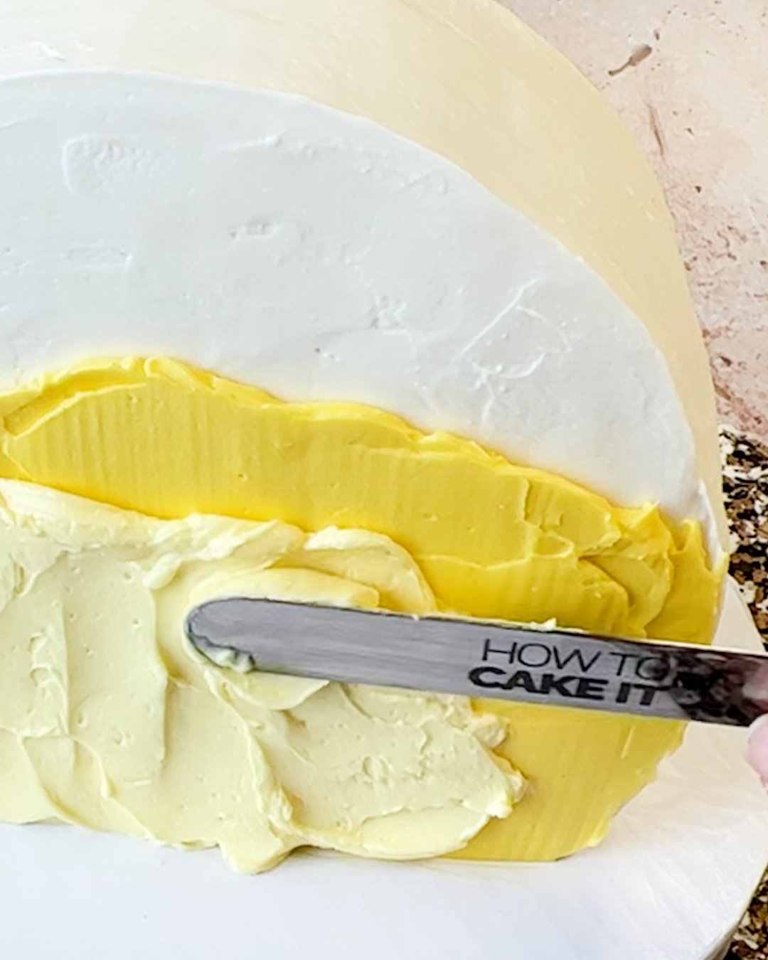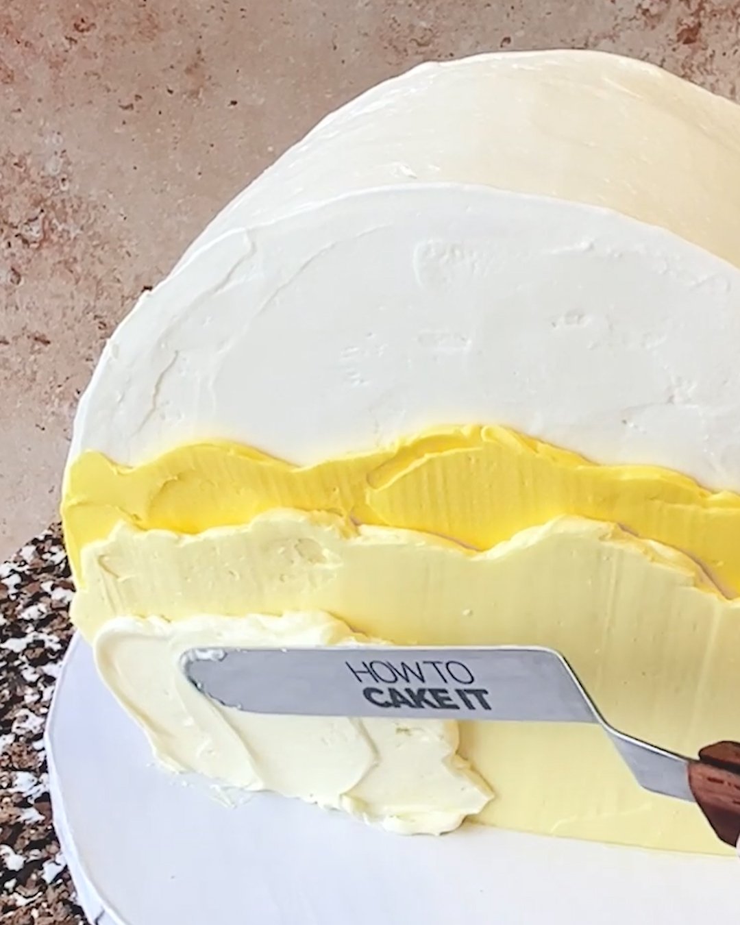 Color your buttercream in three shades of yellow (or any color of your choice), and use a small offset spatula to "paint" an abstract pattern on the cake. Chill in between each color of buttercream to make sure the colors do not smear!
