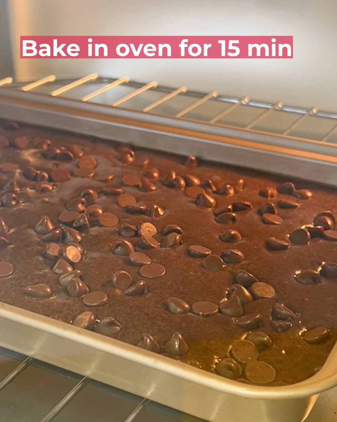 Pour your batter into your prepared brownie pan, and use an offset spatula to smooth out the top. Sprinkle on your chocolate chips.