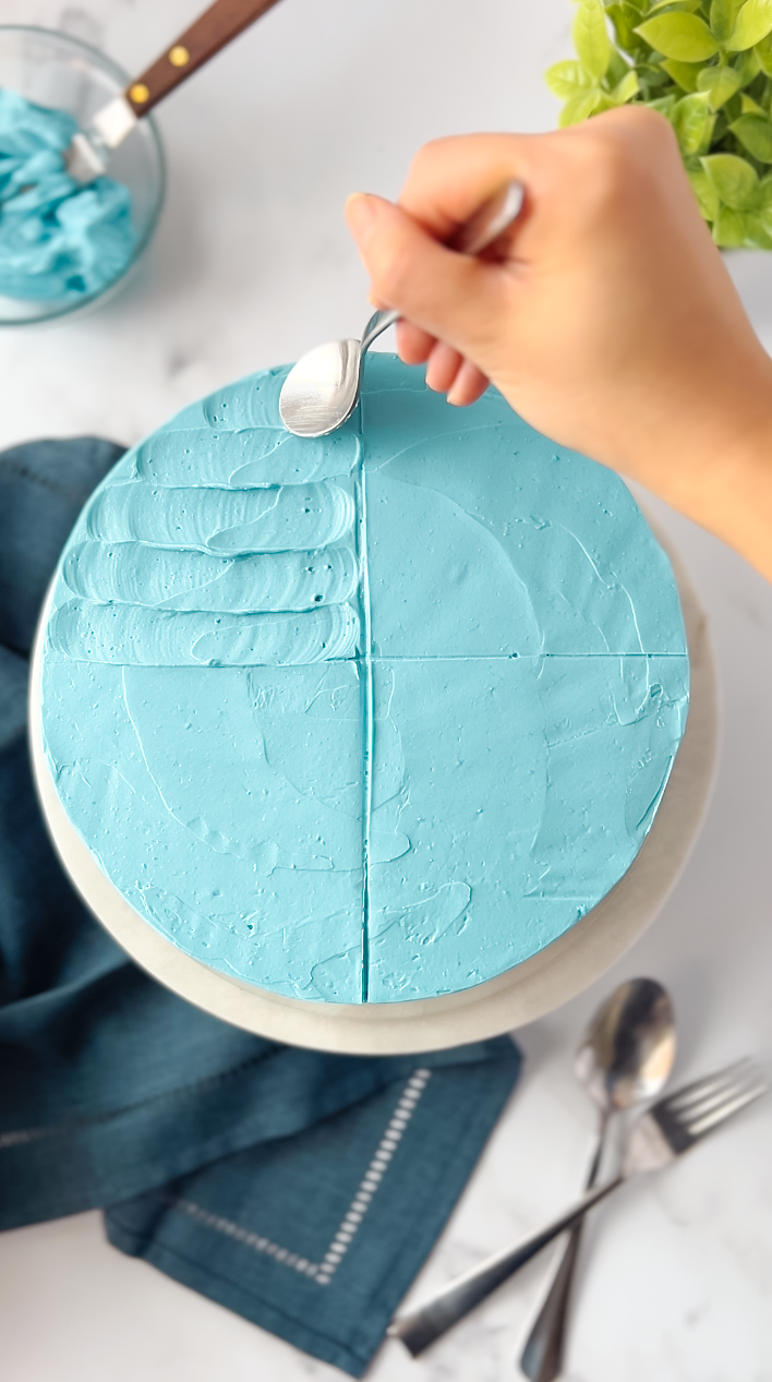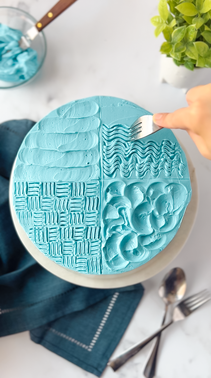 It seems almost ridiculous to type this out because it’s so simple- but you just drag your fork through the buttercream in a wavy squigle from the top to bottom. This is a fun look for an entire cake, but also makes an excellent easy ocean for a beach theme if you’re going the graham cracker crumb beach/gummy shark route.