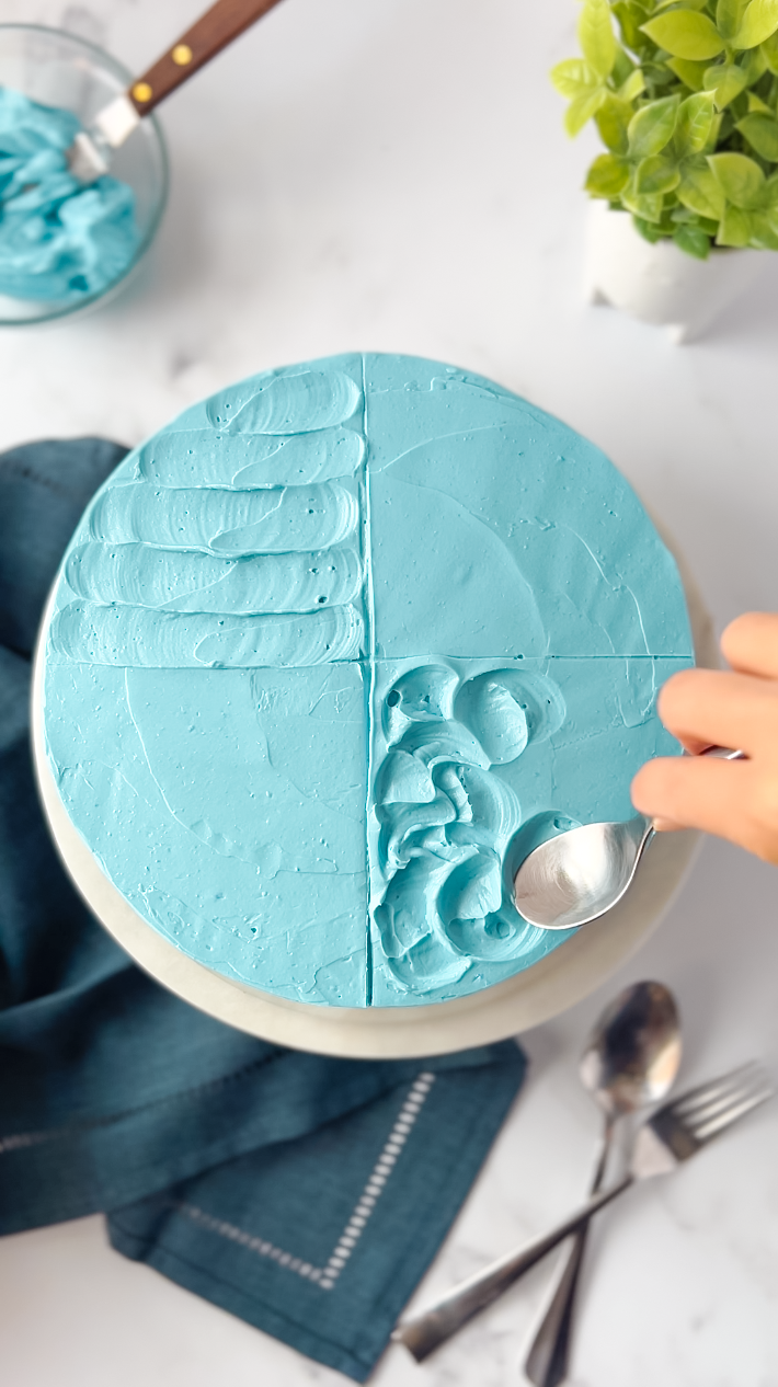 Using the back of a small or medium spoon, push into the buttercream and swivel the spoon from side to side making an imprint. Repeat, overlapping your imperfect imprints across the entire top and sides of the cake. This is a fun technique for those of us who aren’t great with precision- a little messiness comes with the vibe!