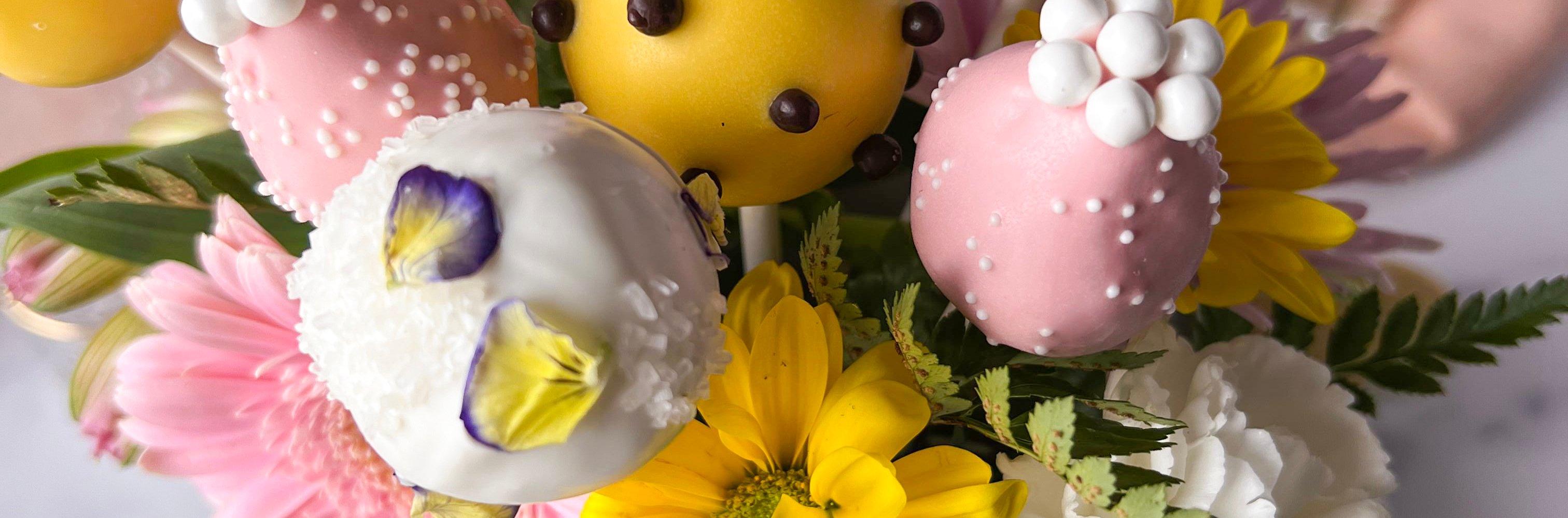 Once your treats on sticks are ready to go, arrange them in a super cute vase with your fresh flowers. Secure the stems and sticks into styrofoam or a block of playdough. Adding in a pop of green or white with leaves and baby’s breath is a great way to make it look like a “real” bouquet. Keep your masterpiece in the fridge until you're ready to enjoy so the treats stay fresh and the flowers don’t wilt.